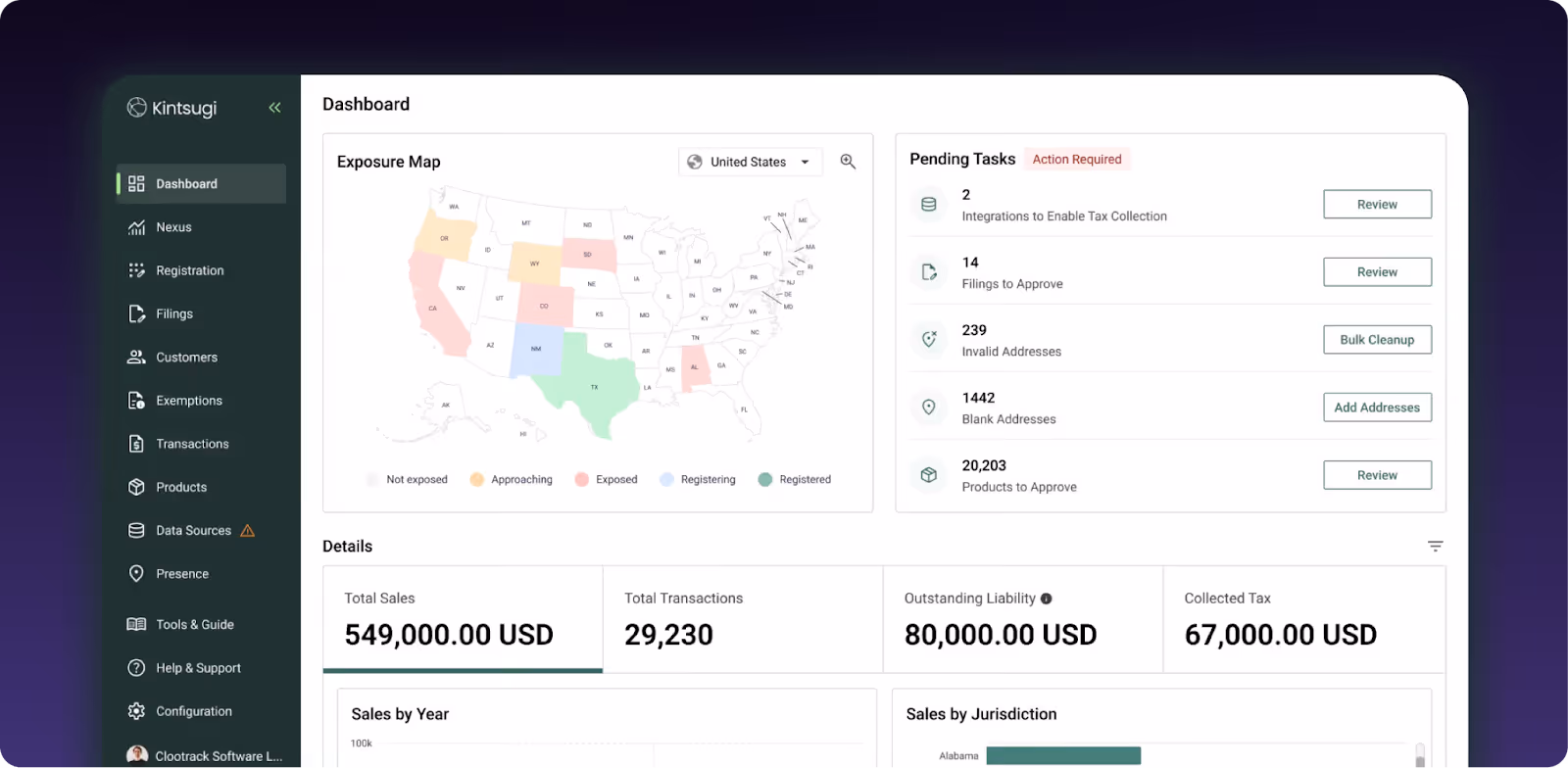Their free plan covers basic nexus tracking, making it accessible for early-stage companies. But note that Kintsugi is US-only and you'll need additional tools for international sales.